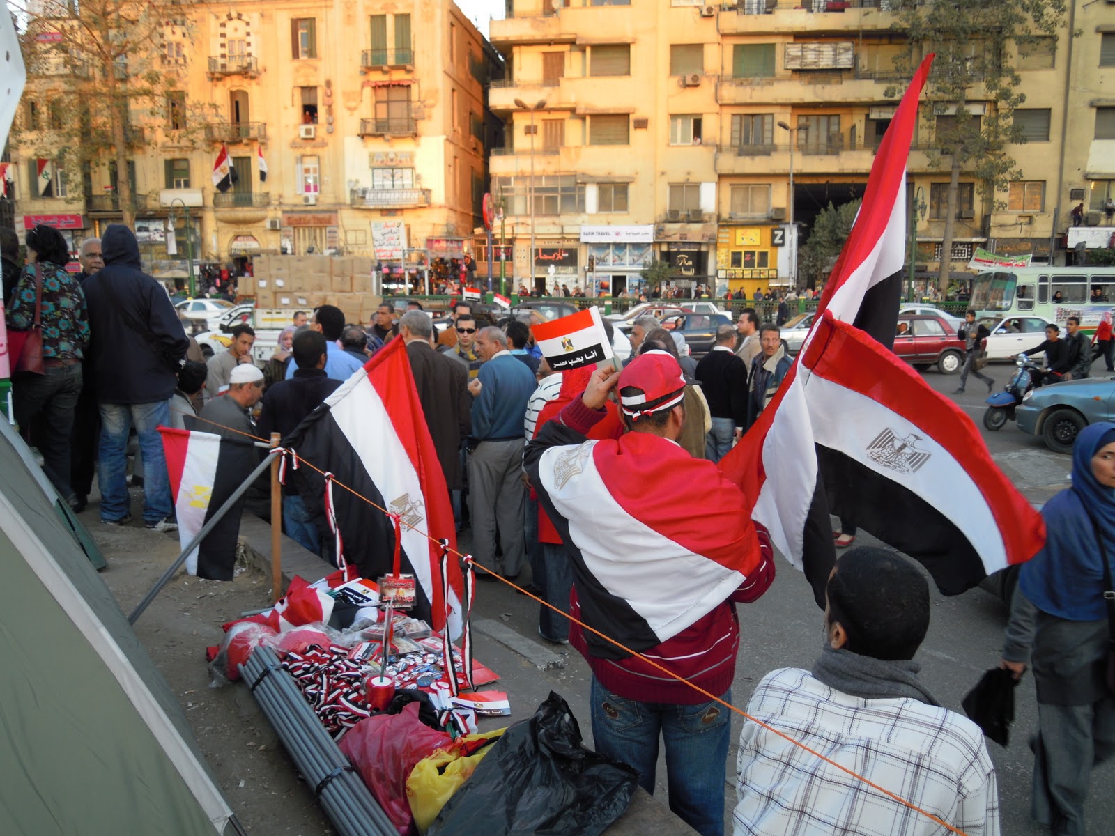 At the moment, when approaching Tahrir Square, one might get the idea that the Egyptian national team must be playing in the Soccer World Championship. Everywhere street-sellers offer different items in the colors of the Egyptian flags, even the hats, which are typical for soccer fans and other kinds of gadgets with football symbols, can be purchased. However, the more the visitor comes nearer, the clearer he/she can see that the souvenirs, which are sold, are labeled after the “Revolution of the 25th of January 2011”. Pins are decorated with the line “Hold your head up high, you are Egyptian” and Plastic badges are sold with the pictures of the “Martyrs of the Revolution of the 25th of January 2011”.